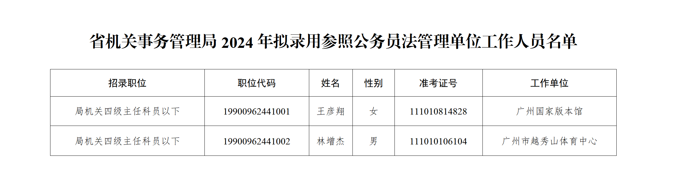 根据《中华人民共和国公务员法》、《公务员录用规定》的有关规定,及《广东省2024年考试录用公务员工作实施方案》要求,经笔试、面试、体检和考察等程序,拟确定王彦翔、林增杰等2名同志为我局2024年考试录用参照公务员法管理单位工作人员的录用人选,现予公示。